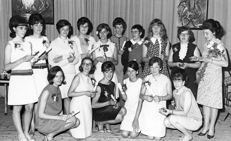 Diploma / getuigschrift uitreiking MAS Mater Amabilisschool Halsteren. Vlnr staand Joke Brouwers - Coby Brouwers - Toos van Loon - Dien Theuns - Annie van Rijen - Annemiek van Eekeren - Betsie de Wit - x - Leen Meesters - juffrouw de Goffau van Kaam Zittend Leen de Zwart - x - Lies van Elzakkers - x - x - x Joke Snepvangers en Corry Somers (bron FB 2021)