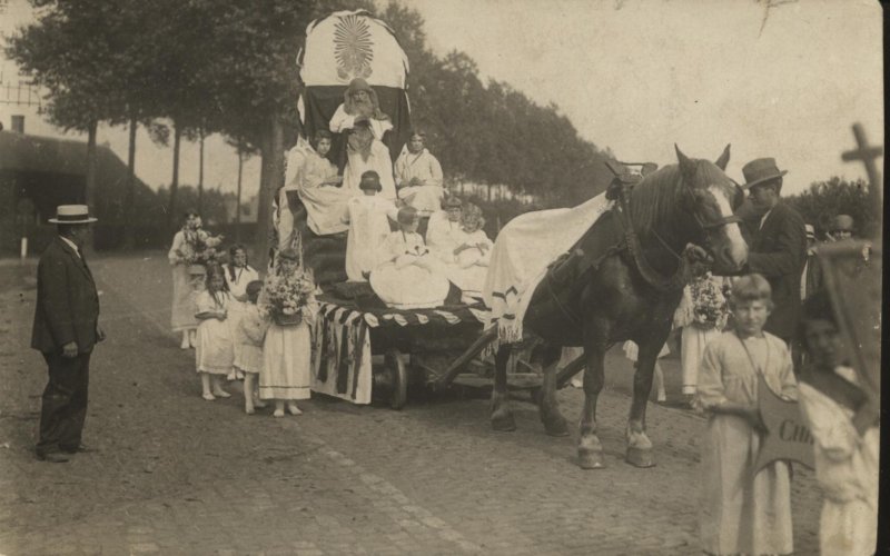 Missie optocht met paard en wagen.