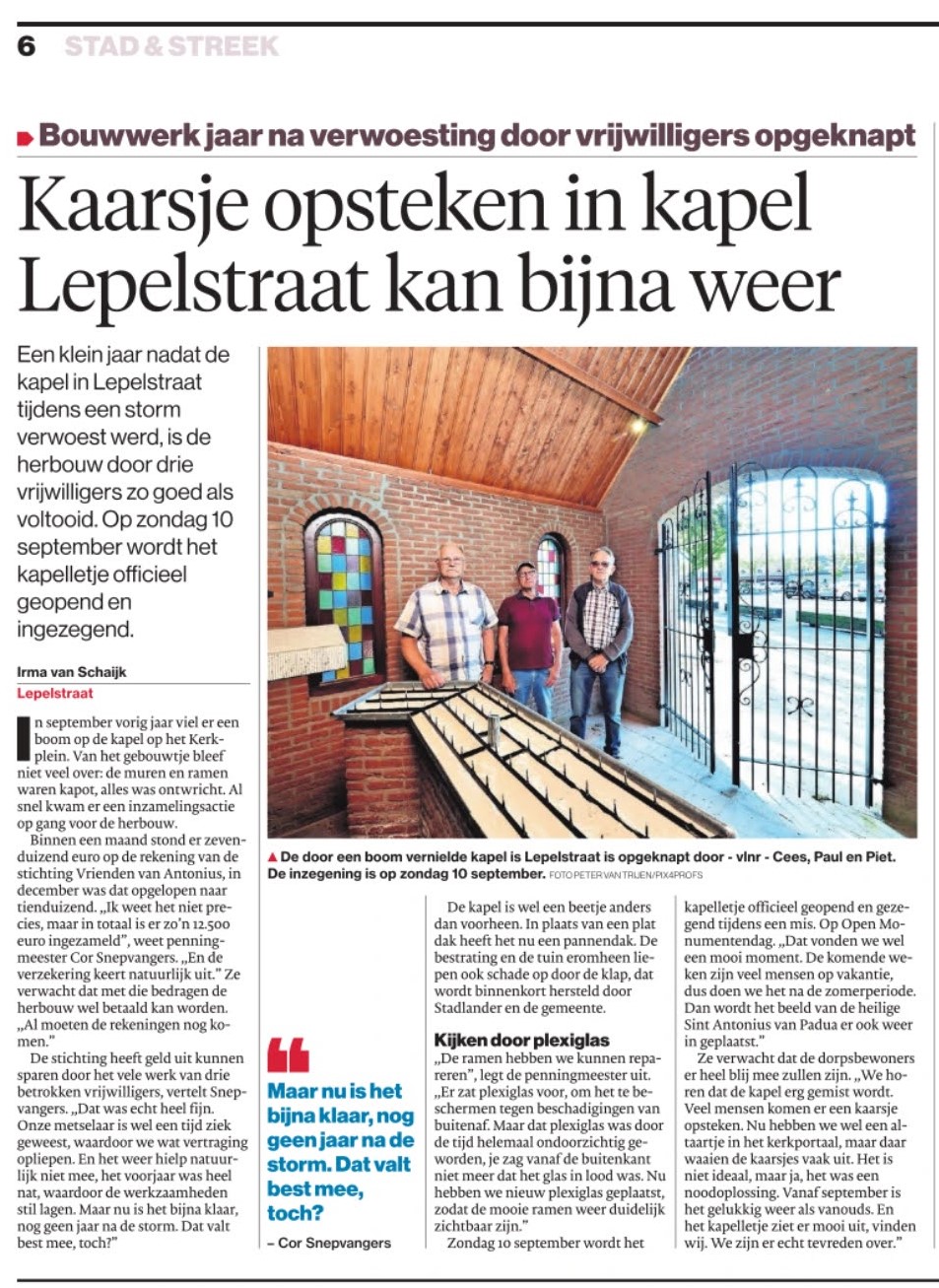 Inzamelingsactie voor herbouw van de kapel : De Parochiekerncommissie zet zich er voor in om de kapel zo snel mogelijk weer op te bouwen. Hier zit veel tijd en geld in. Het bestuur van Stichting Vrienden van Antonius Lepelstraat heeft een actieplan opgesteld om zo met diverse acties en activiteiten geld in te zamelen. We willen mensen vragen iets bij te dragen en hebben daarom een bankrekeningnummer van de stichting die bestemd is voor donaties voor het herstel van de kapel. De stichting wilt het kerkgebouw en de Antoniuskapel in onderhoud voorzien en daarmee de gebouwen zo lang mogelijk behouden. Doneren Het bankrekeningnummer van de Stichting vrienden van Antonius Lepelstraat is: NL14 RABO 0306 1943 68. Het gedoneerde geld komt 100% ten goede aan het terugbouwen van de kapel.