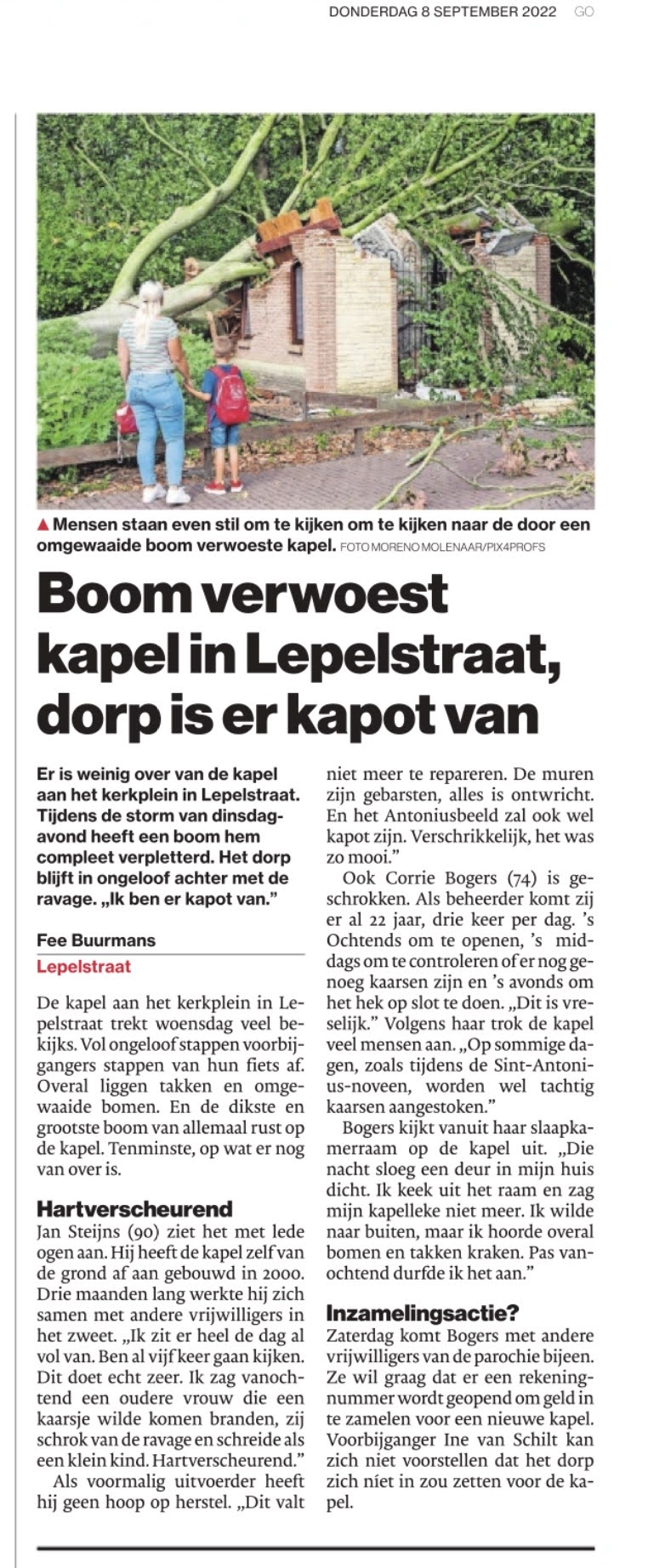 De kapel is totaal verwoest door de boom die er op is gevallen.