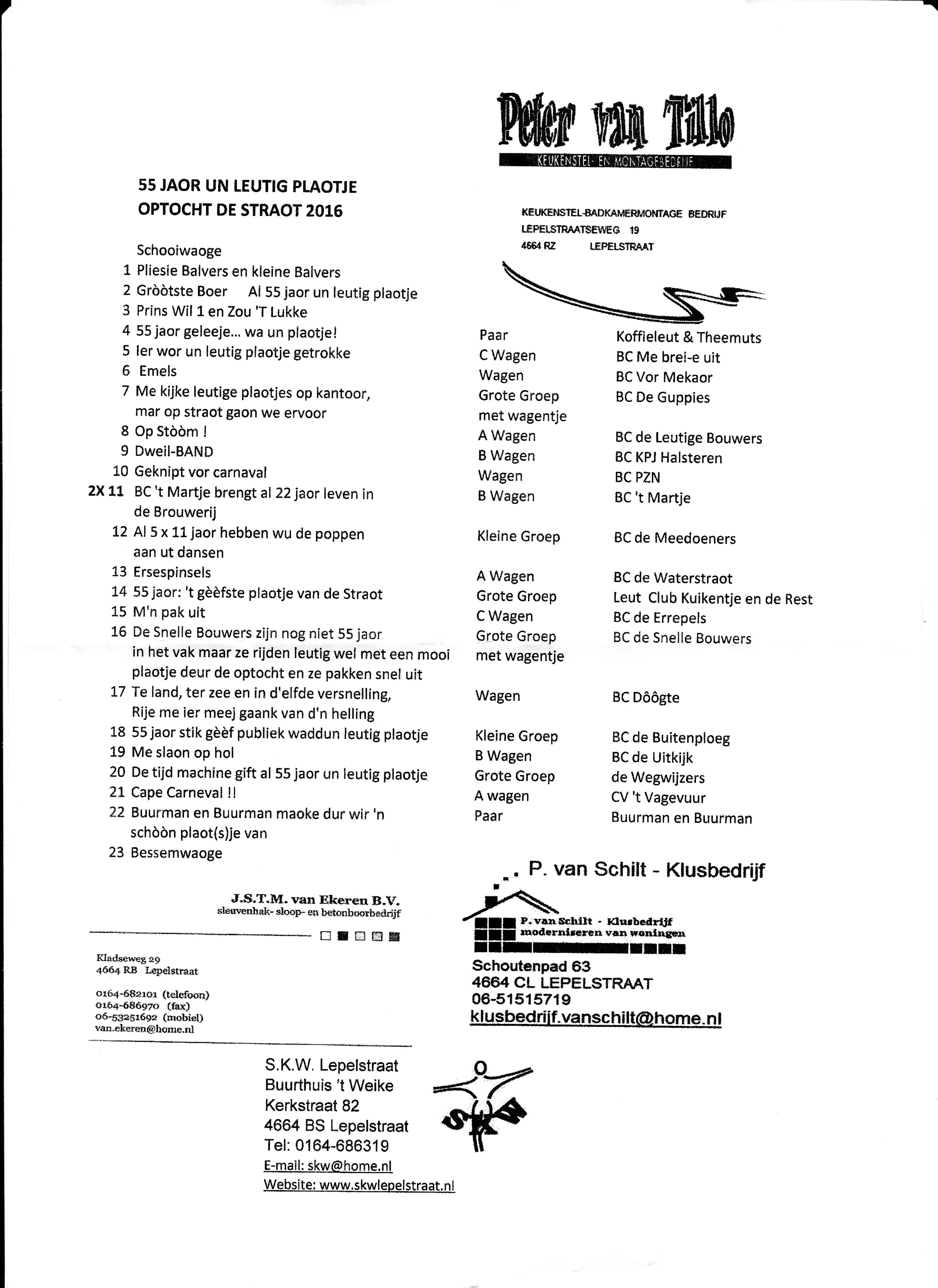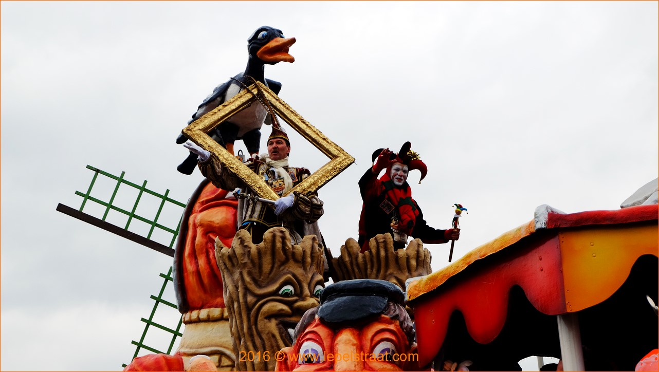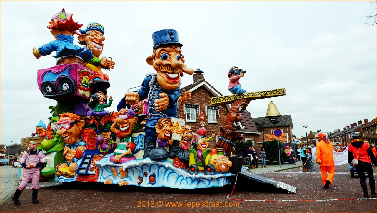 Nadat de burgemeester en de wethouders wat feestelijke attributen hadden ontvangen. Kon de leutstoet vertrekken. Voor enkele A-wagens is de optocht van Lepelstraat altijd een try-out voor de grote optocht van dinsdag in het Krabbegat. Zoals voor de wagen van de Leutige Bouwers die over 'Berrege op Stòòm' ging en die daarmee de eerste prijs won. (Bron BndeStem)