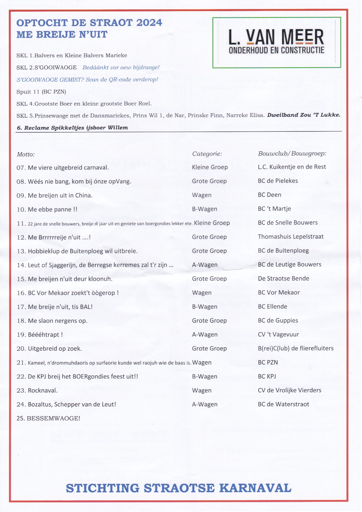 Uitslag prijswinnaars Deelnemers lijst optocht Karnaval Lepelstraat 2024