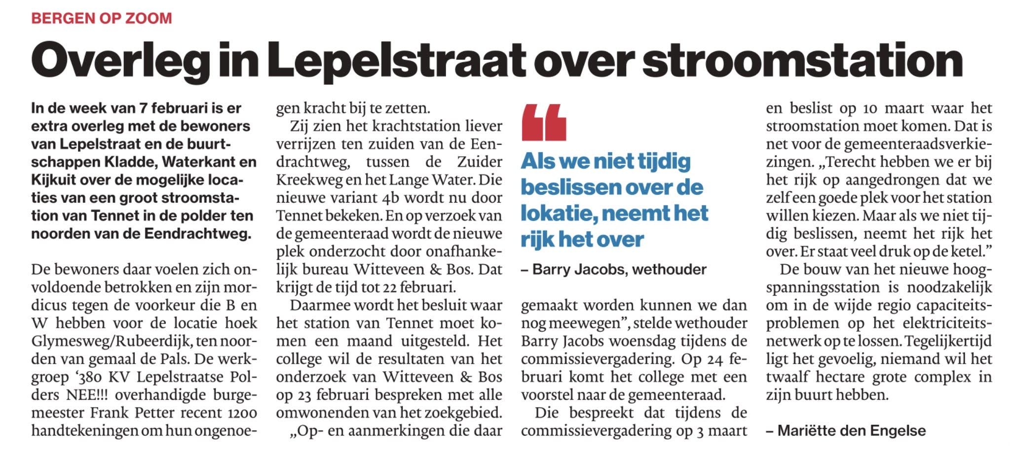 In de week van 7 februari is er extra overleg met de bewoners van Lepelstraat en de buurtschappen Kladde, Waterkant en Kijkuit over de mogelijke locaties van een groot stroomstation van Tennet in de polder ten noorden van de Eendrachtweg. De bewoners daar voelen zich onvoldoende betrokken en zijn mordicus tegen de voorkeur die B en W hebben voor de locatie hoek Glymesweg/Rubeerdijk, ten noorden van gemaal de Pals. De werkgroep '380 KV Lepelstraatse Polders NEE!!! overhandigde burgemeester Frank Petter recent 1200 handtekeningen om hun ongenoegen kracht bij te zetten. Zij zien het krachtstation liever verrijzen ten zuiden van de Eendrachtweg, tussen de Zuider Kreekweg en het Lange Water. Die nieuwe variant 4b wordt nu door Tennet bekeken. En op verzoek van de gemeenteraad wordt de nieuwe plek onderzocht door onafhankelijk bureau Witteveen & Bos. Dat krijgt de tijd tot 22 februari. Daarmee wordt het besluit waar het station van Tennet moet komen een maand uitgesteld. Het college wil de resultaten van het onderzoek van Witteveen & Bos op 23 februari bespreken met alle omwonenden van het zoekgebied. ,,Op- en aanmerkingen die daar gemaakt worden kunnen we dan nog meewegen", stelde wethouder Barry Jacobs woensdag tijdens de commissievergadering. Op 24 februari komt het college met een voorstel naar de gemeenteraad.Die bespreekt dat tijdens de commissievergadering op 3 maart en beslist op 10 maart waar het stroomstation moet komen. Dat is net voor de gemeenteraadsverkiezingen. ,,Terecht hebben we er bij het rijk op aangedrongen dat we zelf een goede plek voor het station willen kiezen. Maar als we niet tijdig beslissen, neemt het rijk het over. Er staat veel druk op de ketel." De bouw van het nieuwe hoogspanningsstation is noodzakelijk om in de wijde regio capaciteitsproblemen op het elektriciteitsnetwerk op te lossen. Tegelijkertijd ligt het gevoelig, niemand wil het twaalf hectare grote complex in zijn buurt hebben. Mariëtte den EngelseDe werkgroep wil een ieder bedanken voor zijn/haar inzet van "teken de petitie"