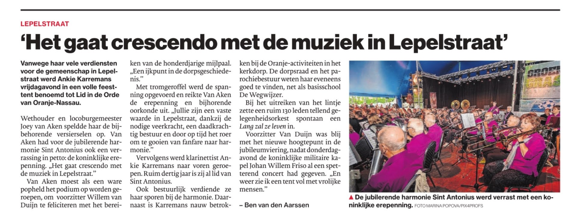 Of je nu houdt van klassieke werken, moderne arrangementen of feestelijke optredens: bij Harmonie Sint Antonius is er voor iedereen plek. De vereniging blijft investeren in jeugd en opleiding, zodat ook de volgende generaties muziek blijven maken in Lepelstraat.