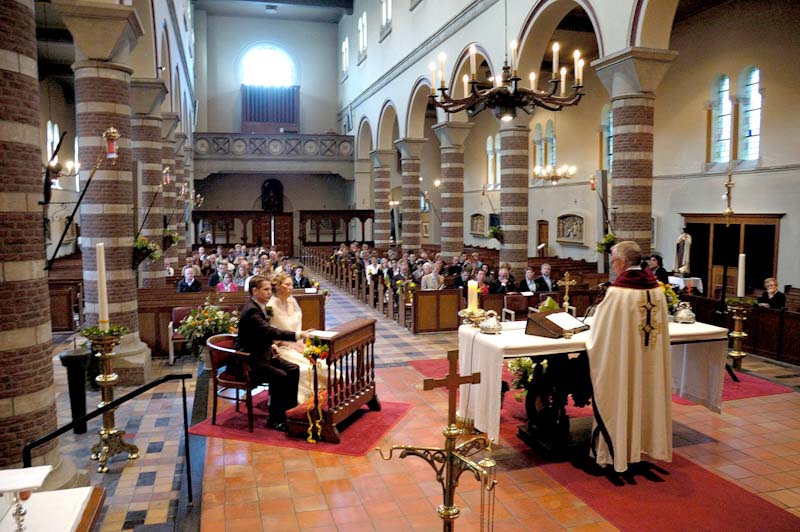 Trouwen in de mooi met bloemen versierde kerk. Pastoor Wiertz met de huwelijks voltrekking in de sint antonius kerk.