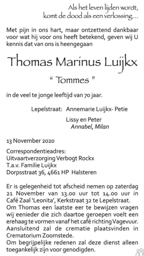 van Tommes Luijkx is voorgoed voorbij. De naaste familie wordt alle